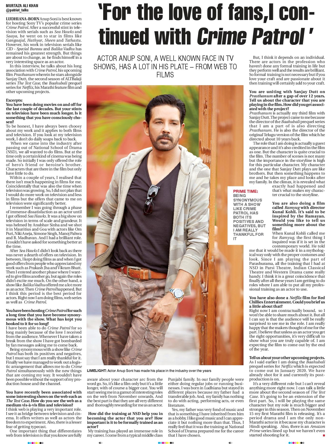`For the love of fans,I continued with Crime Patrol LUDHIANA-BORN Anup Soni is best known for hosting Sony TV s popular crime series Crime Patrol. After a successful stint in television with serials such as Sea Hawks and Saaya, he went on to star in films like Gangaajal, Hathyar, Sheen and Tathastu. However, his work in television serials like CID - Special Bureau and Balika Vadhu has remained his greatest strength. But things are about to change, as he finds himself in a very interesting space as an actorIn this interview, he talks about his long association with Crime Patrol, his upcoming film Prasthanum wherein he stars alongside Sanjay Dutt, the second season of ALTBalaji series The Test Case, the Baahubali prequel series for Netflix, his Marathi feature film and other upcoming projects. Excerpts: You have been doing movies on and off for the last couple of decades. But your stints on television have been much longer. Is it something that you have consciously chosen? To be honest, I have always been choosy about my work and it applies to both films and television. If you look at my television work, I don t do daily soaps back to backWhen we came into the industry after passing out of National School of Drama (NSD), we all wanted to do films. But at the time only a certain kind of cinema was being made. So initially I was only offered the role of hero s friend or heroine s brother. Characters that are there in the film but only have little to doWithin a couple of years, I realised that there isn t much happening in films for me. Coincidentally that was also the time when television was growing. So, I did not plan that I would do more work on television and less in films but the offers that came to me on television were significantly betterI remember I was going through a phase of immense dissatisfaction as an actor until I got offered Sea Hawks. It was a big show on television in terms of scale and grandeur. It was helmed by Anubhav Sinha and we shot it in Mauritius and Goa with actors like Om Puri, Niki Aneja, Simone Singh, Manoj Pahwa and R. Madhavan. And I had a brilliant role. I couldn t have asked for something better at the timeAfter Sea Hawks I didn t look back as there was never a dearth of offers on television. In between, I kept doing films as and when I got good offers from people who appreciated my work such as Prakash Jha and Vikram Bhatt. Then I entered another phase where I wanted to give films another go, but again the roles didn t excite me much. On the other hand, a show like BalikaVadhu offered me a lot more as an actor.Then Crime Patrol happened. But I think this period is the best period for actors. Right now I am doing films, web series as well as Crime Patrol. You have been hosting Crime Patrol for such a long time that you have become synonymous with the show. What has kept you hooked to it for so long? I have been able to do Crime Patrol for so long mainly because of the love I received from the audience. Whenever I have taken a break from the show I have got bombarded by fan messages asking me to come backBeing synonymous with a show like Crime Patrol has both its positives and negatives, but I must say that I am really thankful for it. Finally we have managed to work out a logistic arrangement that allows me to do Crime Patrol simultaneously with the new things that are coming my way. It wouldn t have been possible without the support of my production house and the channel. You have recently been associated with some interesting shows on the web such as The Test Case. How do you see the web as a medium vis-à-vis film and television? I think web is playing a very important role. I see it as bridge between television and cinema. It offers writers as well as actors the freedom to experiment. Also, there is a lesser fear of getting typecastOne important thing that differentiates web from television is that you know are fully aware about your character arc from the word go. So, it s like a film only but it s a little longer, with of course a bigger cast. You will start seeing me in a gamut of interesting roles on the web from November onwards. And the best part is that they are all very different and thoroughly rewarding for me as an actor. How did the training at NSD help you in becoming the actor that you are? How important is it to be formally trained as an actor? My training has played an immense role in my career. I come from a typical middle class Punjabi family. In our family people were either doing regular jobs or running businesses. I was born in Ludhiana but stayed in different places because my father had a transferable job. And, my family has nothing to do with acting, performing acts, or even literatureYes, my father was very fond of music and that is something I have inherited from him as a hobby. I like good music and I can appreciate it but nothing more than that. Thus, I really feel that it was the training at National School of Drama prepared me for the career that I have chosen. But, I think it depends on an individual. There are actors in the profession who haven t done any formal training in life but they perform well and the results are brilliant. So formal training is not necessary but if you love your craft and are passionate about it then training will certainly add to your craft You are uniting with Sanjay Dutt on Prasthanum after a gap of over 12 years. Tell us about the character that you are playing in the film.How did you get associated with the project? Prasthanum is actually my third film with Sanjay Dutt.The project came to me because the director of the Baahubali prequel series that I am a part of is also directing Prasthanum. He is also the director of the original Telugu version of the film which he directed about 10 years back The role that I am doing is actually a guest appearance and it s also credited in the film as one. But the character is quite crucial to the film. The number of scenes is not many but the importance in